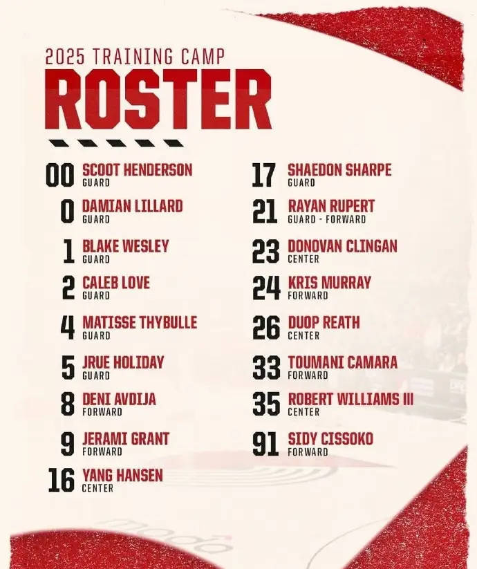 北京时间2025年9月30日,开拓者公布了新赛季训练营17人大名单。具体如下:斯科特-亨德森、达米恩-利拉德、布莱克-韦斯利、凯莱布-乐福、马蒂斯-塞布尔、朱-霍乐迪、德尼-阿夫迪亚、杰拉米-格兰特、杨瀚森、谢登-夏普、拉杨-吕佩...
